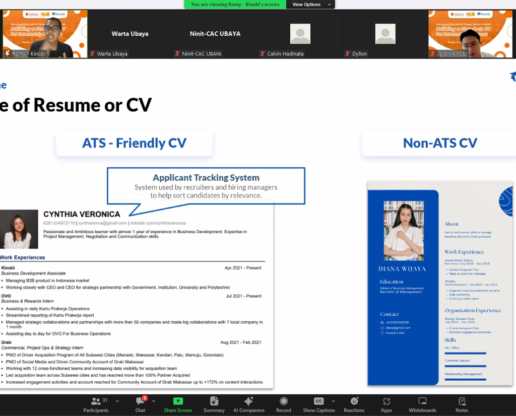 Kamis, 14 Desember 2023, Career Assistance Center Universitas Surabaya (CAC Ubaya) menyelenggarakan kolaborasi dengan tajuk “Building a Standout CV for Internship Success”. Kolaborasi yang diadakan ini bertujuan untuk memberikan pengetahuan kepada mahasiswa Ubaya terkait cara membuat Curriculum Vitae (CV) yang ideal. Menghadirkan Romy Chandra Kurniawan, selaku Customer Success Lead Kinobi, sebagai narasumber, acara kolaborasi ini diadakan secara daring melalui Zoom dihadiri puluhan peserta mahasiswa Ubaya dari berbagai fakultas.