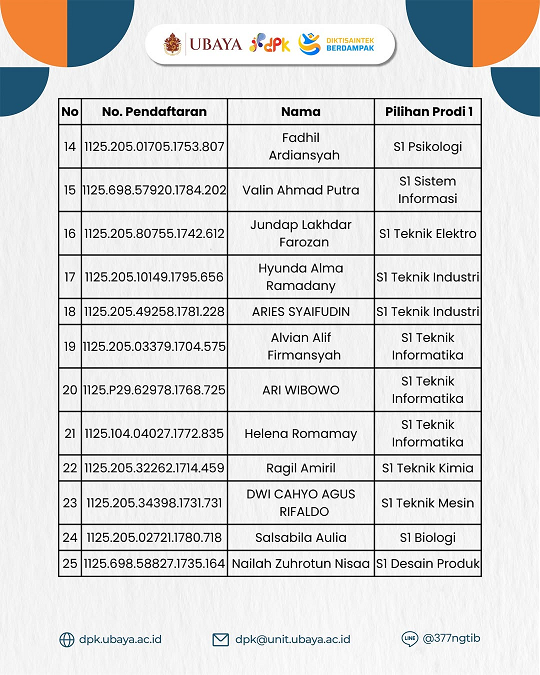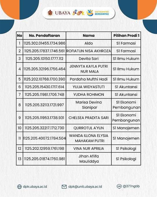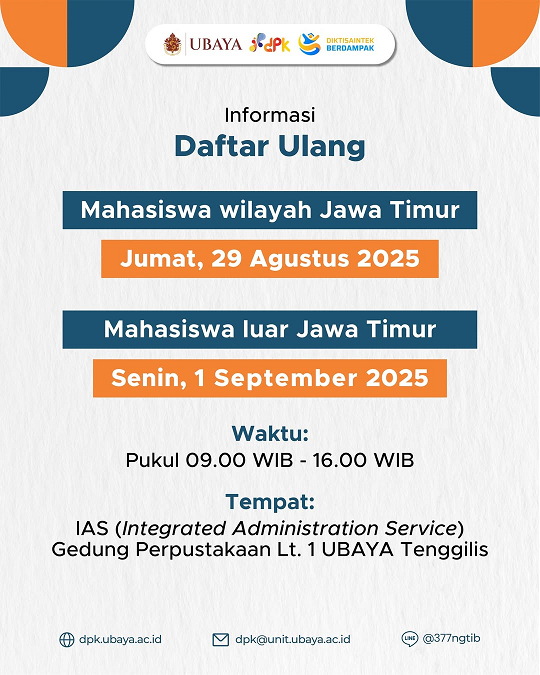 Pengumuman Daftar Peserta Lolos KIP Kuliah Universitas Surabaya https://dpk.ubaya.ac.id/pengumuman-daftar-peserta-lolos-kip-kuliah-universitas-surabaya/ Fri, 29 Aug 2025 07:37:56 +0000 https://dpk.ubaya.ac.id/?p=9207 Halo semua๐Ÿ‘‹ Selamat untuk 25 siswa yang berhasil lolos tahap seleksi akhir dan bergabung dalam keluarga besar Universitas Surabaya ๐ŸŽ‰ Adapun jadwal daftar ulang adalah sebagai berikut:๐Ÿ“Œ Mahasiswa wilayah Jawa Timurโ†’ Jumat, 29 Agustus 2025๐Ÿ“Œ Mahasiswa luar Jawa Timur โ†’ Read More ...