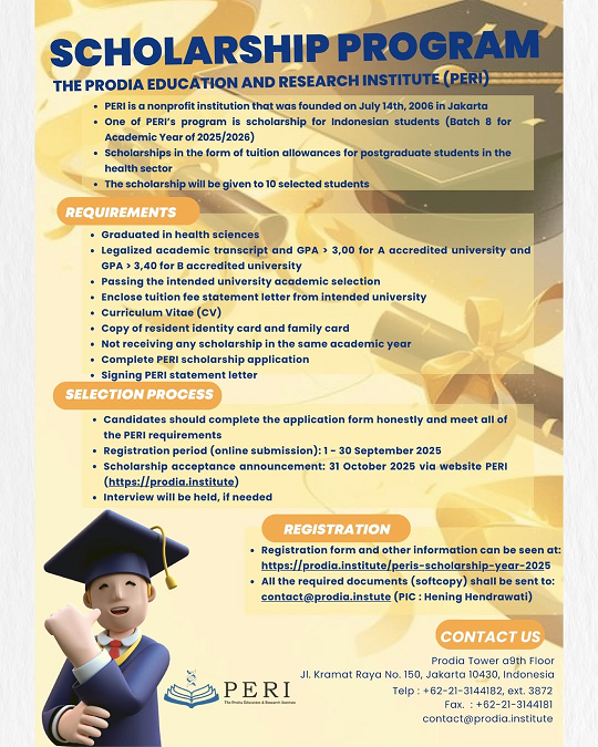 PRODIA Education and Research Institute (PERI) menawarkan program beasiswa bagi mahasiswa pascasarjana di bidang kesehatan untuk tahun ajaran 2025/2026. Beasiswa ini, yang mencakup tunjangan biaya kuliah, menargetkan 10 mahasiswa terpilih.