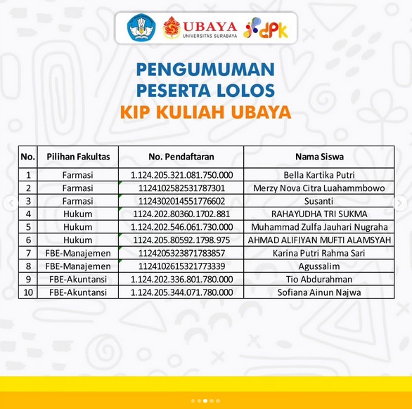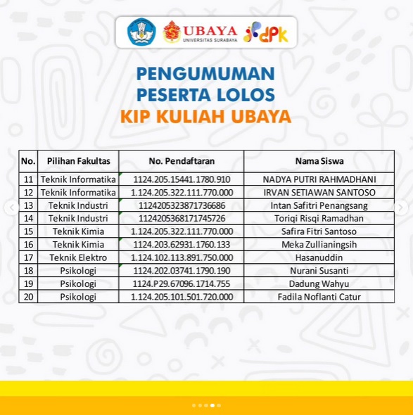 Selamat untuk 20 siswa yang berhasil lolos tahap seleksi akhir dan bergabung dalam keluarga besar Universitas Surabaya 🎉