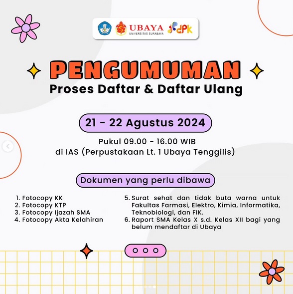 Untuk tahapan selanjutnya yaitu teman-teman akan melakukan proses Daftar dan Daftar Ulang pada 21-22 Agustus 2024 pukul 09.00 menuju IAS (Perpustakaan Lt. 1 Ubaya Tenggilis).