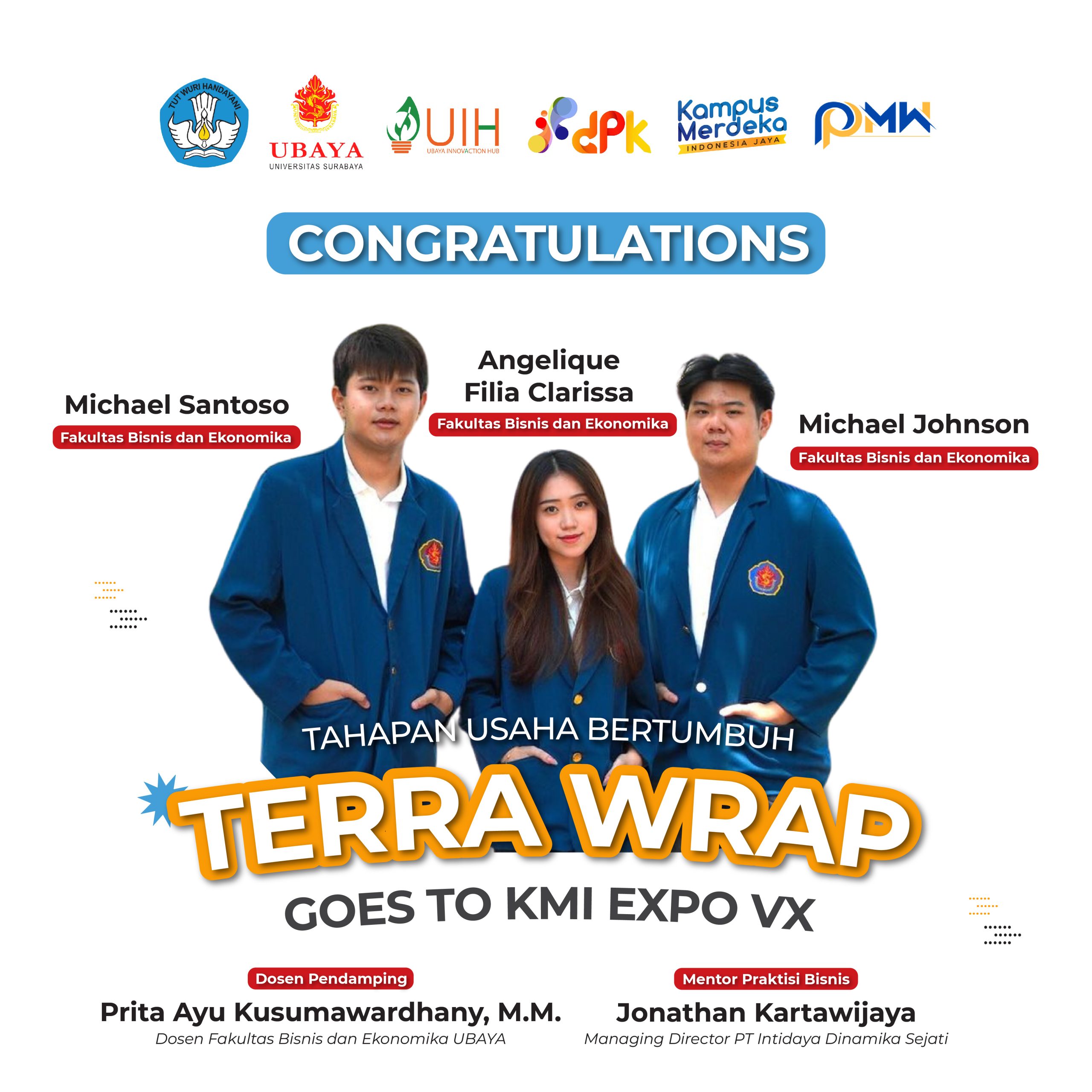 Direktorat Pembelajaran dan Kemahasiswaan, Ditjen Diktiristek telah melakukan penilaian kemajuan dan seleksi Kewirausahaan Mahasiswa Indonesia (KMI) Expo XV 2024 yang diikuti oleh seluruh penerima bantuan Program Pembinaan Mahasiswa Wirausaha (P2MW) 2024. Terra Wrap dan Rosellacious menjadi 2 kelompok usaha yang dinyatakan lolos sebagai peserta KMI Expo XV 2024 yang akan mewakili Universitas Surabaya, serta mengikuti penilaian KMI Award pada tanggal 23-25 Oktober 2024 di Universitas Halu Oleo (UHO), Kota Kendari.