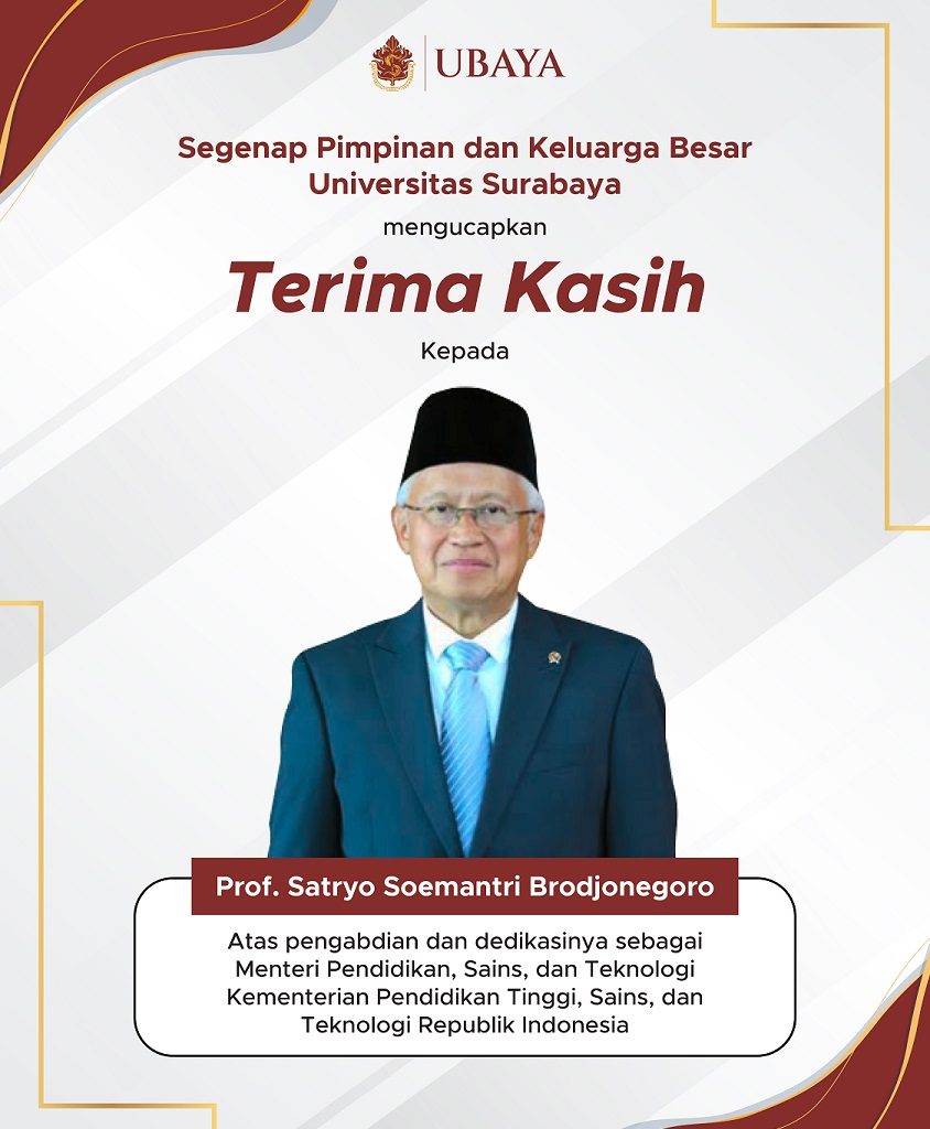 Segenap keluarga besar Universitas Surabaya mengucapkan selamat kepada Prof. Brian Yuliarto atas dilantiknya sebagai Menteri Pendidikan Tinggi, Sains dan Teknologi Indonesia.
