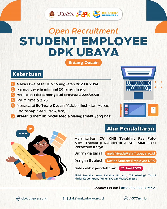 Buat kalian mahasiswa/i Ubaya yang ingin memiliki pengalaman kerja, menambah relasi serta mengasah softskills wajib mendaftar menjadi Student Employee DPK Ubaya.