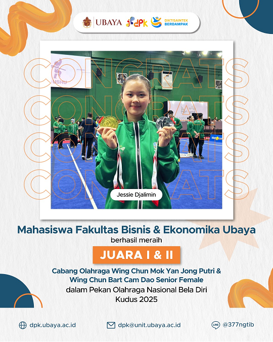 Mahasiswa Fakultas Bisnis dan Ekonomika Ubaya berhasil meraih Juara 1 Cabang Olahraga Wing Chun Mok Yan Jong Putri dan Juara 2 Cabang Olahraga Wing Chun Bart Cam Dao Senior Female dalam Pekan Olahraga Nasional Bela Diri Kudus 2025🏅🎉