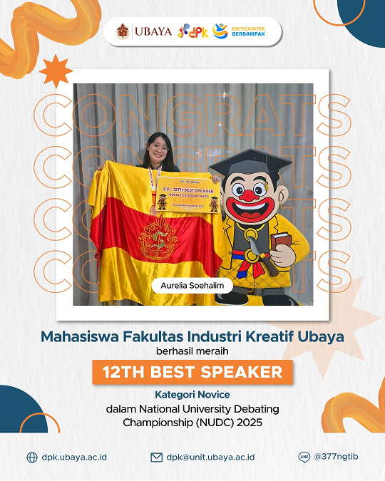 Mahasiswa Fakultas Industri Kreatif Ubaya berhasil meraih 12th Best Speaker Kategori Novice dalam National University Debating Championship (NUDC) 2025π
