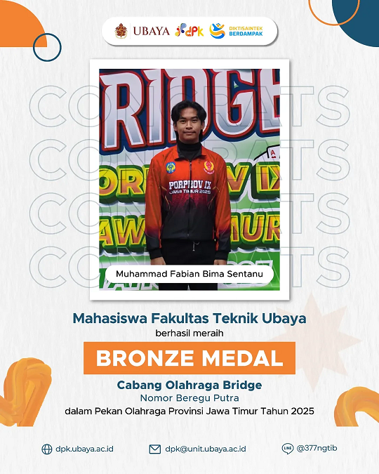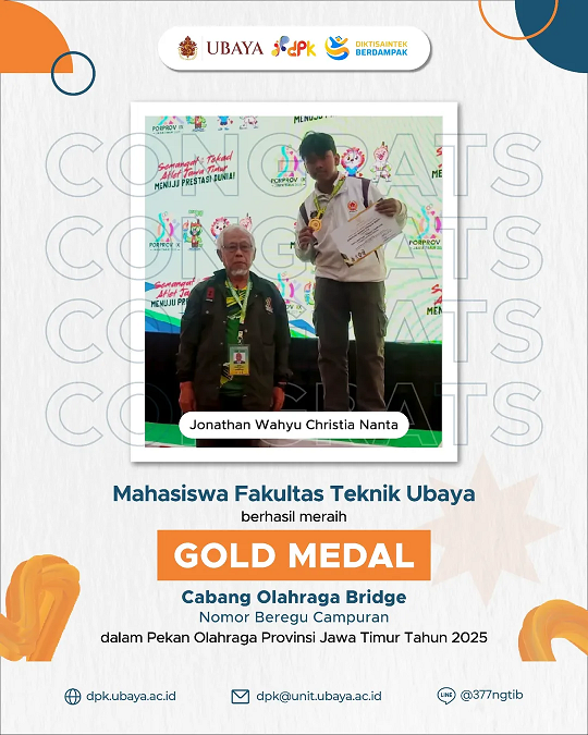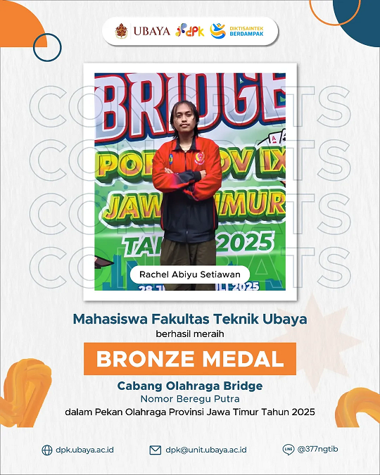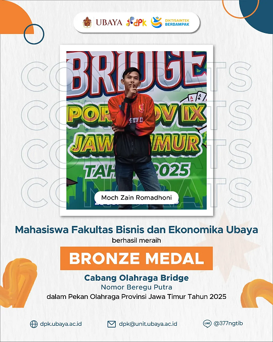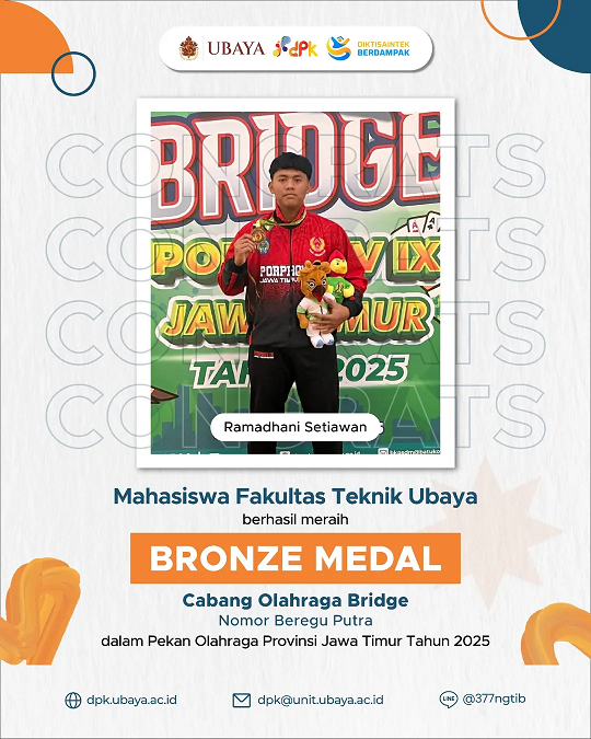 Ada prestasi lagi nih 🔥 Ada 5 mahasiswa dari UBAYA yang berhasil meraih Gold & Bronze Medal pada Cabang Olahraga Bridge dalam Pekan Olahraga Provinsi Jawa Timur Tahun 2025 loh!