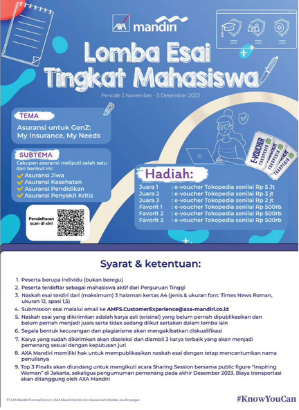 Dalam rangka memeriahkan HUT AXA Mandiri yg ke 20 di agendakan Lomba Esai Tingkat Mahasiswa