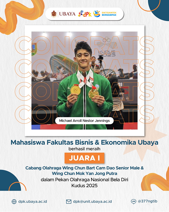 Mahasiswa Fakultas Bisnis dan Ekonomika Ubaya berhasil meraih Juara 1 Cabang Olahraga Wing Chun Bart Cam Dao Senior Male dan Juara 1 Cabang Olahraga Wing Chun Mok Yan Jong Putra dalam Pekan Olahraga Nasional Bela Diri Kudus 2025🏅🎉