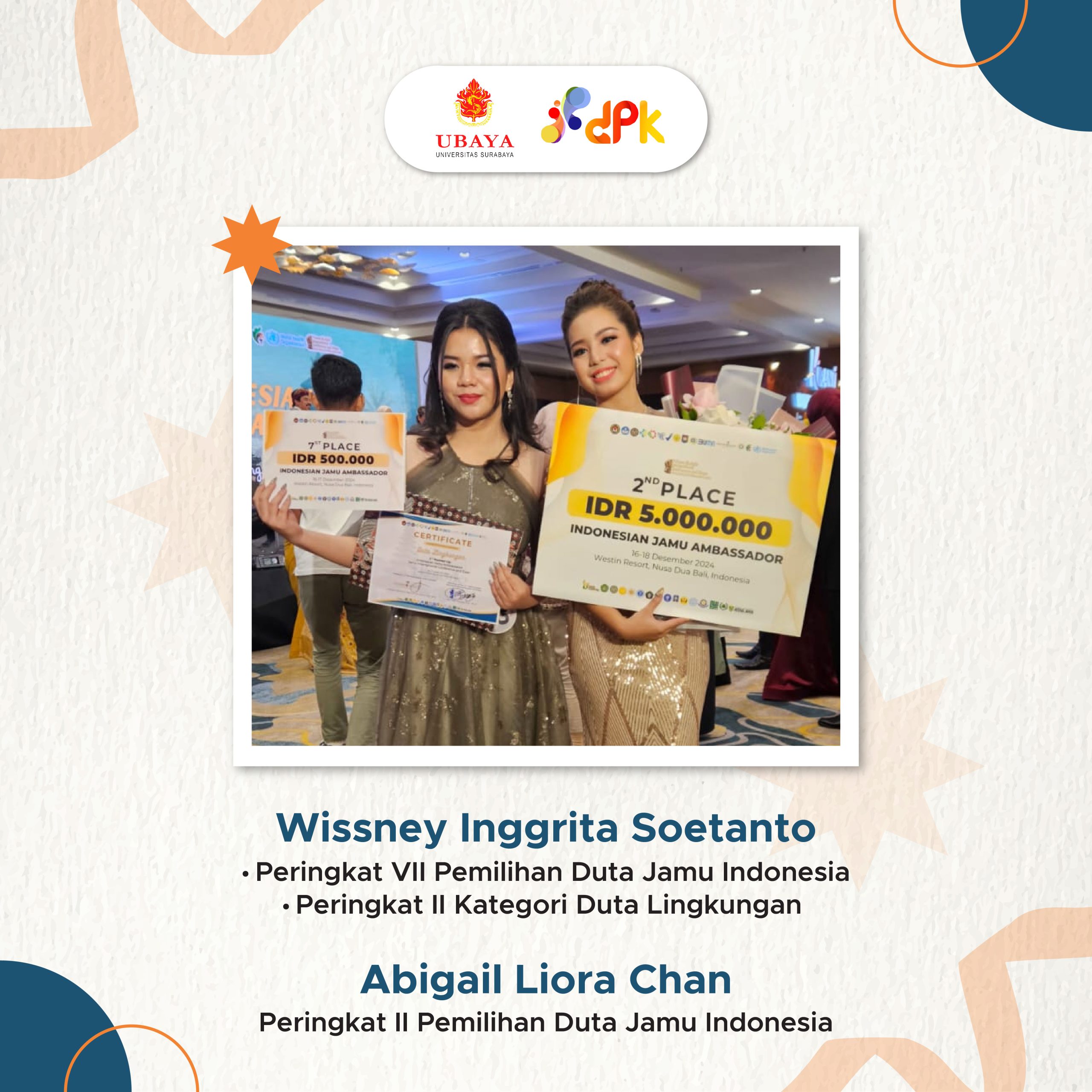 Selamat ya Wissney Inggrita dan Abigail Liora atas prestasi-prestasi yang diraih✨! Semoga prestasi ini dapat menginspirasi semakin banyak mahasiswa UBAYA untuk terus berprestasi😊