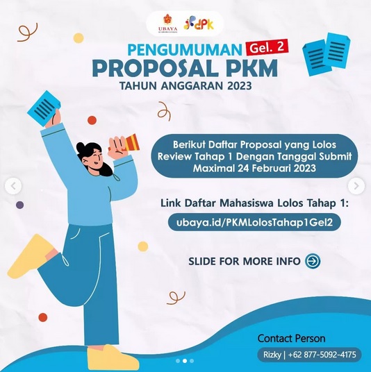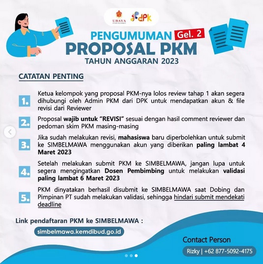 Kami umumkan daftar proposal PKM 2023 yang lolos review tahap 1 dengan tanggal pengumpulan maximal 24 Februari 2023 (Gelombang 2).