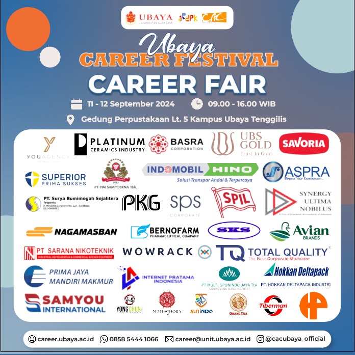 Bagi kalian para fresh graduate yang ingin mencari pekerjaan, dan untuk kalian yang sudah bekerja dan ingin mencari referensi tempat kerja lain, Ubaya Career Festival adalah jawabannya!🥳